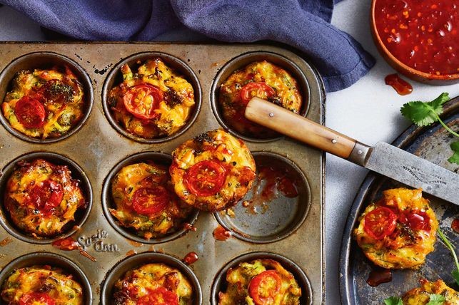 Divide the mixture among the prepared pans (they will be very full) and top with the reserved zucchini and feta. Bake for 30-35 minutes or until the muffins spring back when gently touched. Set aside for 5 minutes to cool slightly. Use a flat-bladed knife to gently loosen each muffin and remove from the pan. Eat warm or at room temperature.