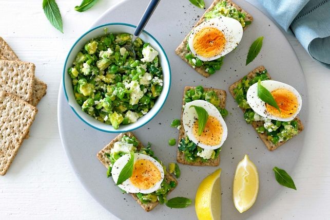 Spread the pea mixture over the Vita-Weats and top with egg. Grind over cracked black pepper and top with mint leaves to serve.
