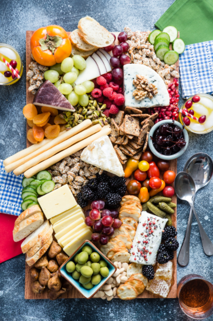 Chop the fruits and veggies into bite sized pieces and arrange decoratively around the board along with the remaining ingredients.
