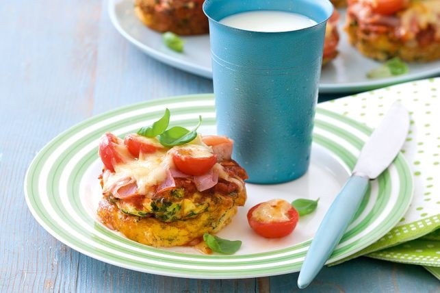 Bake for 15 to 20 minutes or until just set. Stand for 5 minutes before turning out of pan. Preheat grill on high. Place frittatas, top-side up, on a baking tray. Spread tops with pasta sauce. Top with ham, tomatoes and remaining cheese.