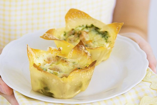 Place 1 wonton wrapper in each hole. Press down firmly to line base and sides.