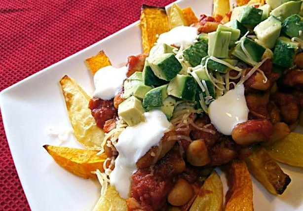 To assemble, lay potatoes and pumpkin on a flat plate. Top with tomato/bean mixture, then grated cheese, avocado and dollops of sour cream.