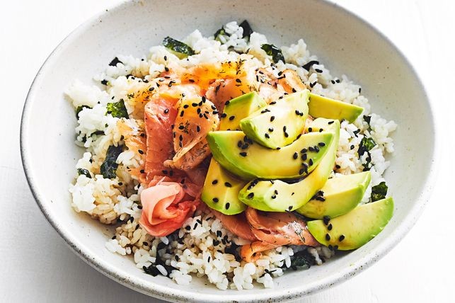 Add tamari and sesame oil to remaining vinegar mixture. Divide rice mixture among bowls. Top with the avocado and salmon. Drizzle with the tamari dressing. Top with sesame seeds, ginger and wasabi, if using.