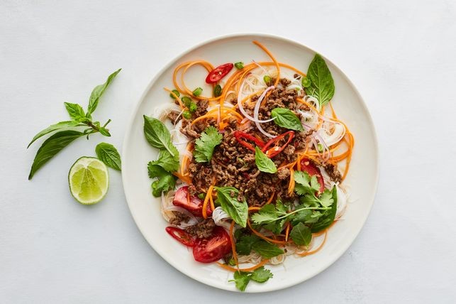 Drain the noodles and transfer to a large bowl. Add the mince mixture, lime dressing, tomato, carrot, onion, beans, basil and coriander and toss to combine. Serve with lime wedges.