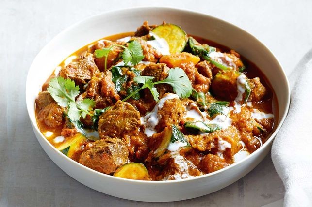 Return beef to pan with tomato and stock. Bring to the boil. Simmer, covered, over low heat for 1 1/2 hours. Add the pumpkin. Simmer, uncovered, for 15 minutes. Add zucchini and 2 tablespoons coconut milk and cook for 5 minutes, until pumpkin is tender. Season. Stir through spinach. Drizzle with remaining 1 tablespoon coconut milk. Top with coriander. Serve with rice.