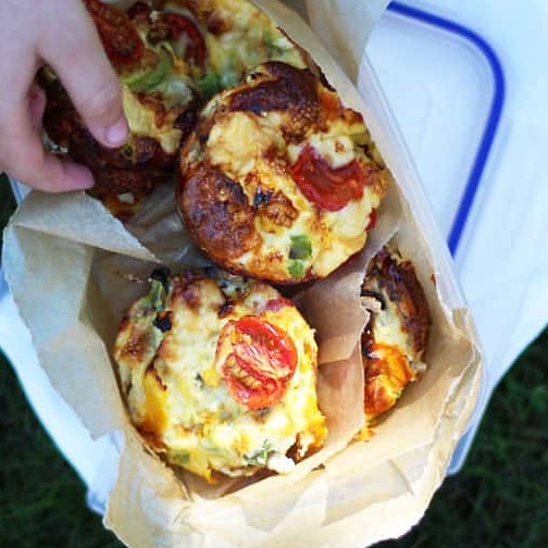 Mini crustless quiches with no pastry, perfect for lunchboxes or even breakfast. Filled with capsicum, mushrooms and tasty ham, this healthy mini quiche recipe also happens to be gluten free