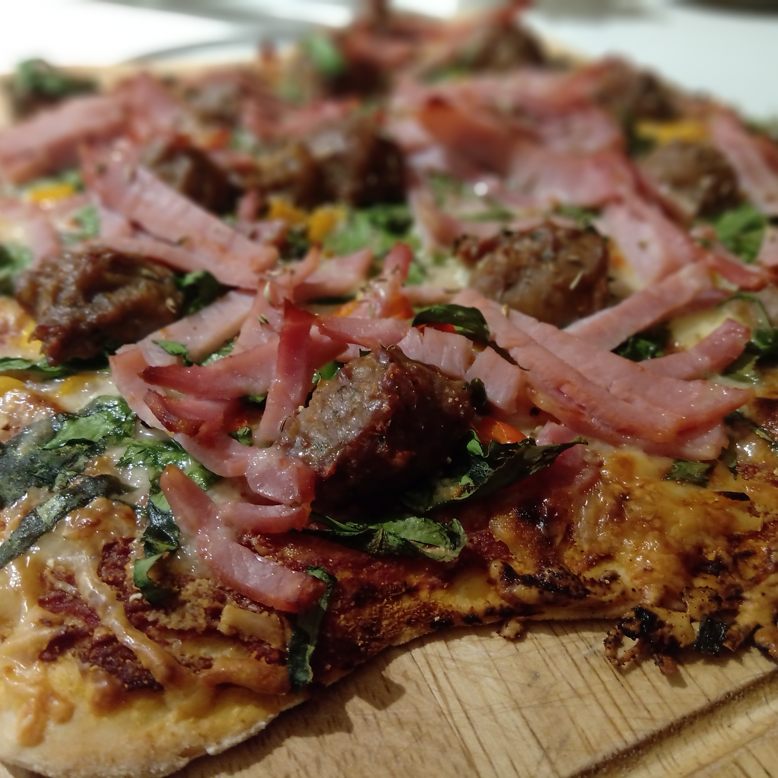 Add the cheese and then the sausages (chopped in small slices) around your pizza along with the sliced bacon